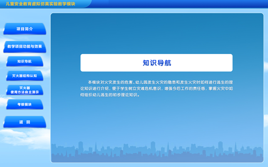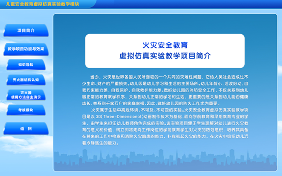 本实验项目主要包括火灾相关知识导航、消防安全活动自主演示、火灾教育教学过程和实验考核四大模块,从了解相关理论知识入手,通过人机互动的方式实现火灾教育——这种高危实验的教学。