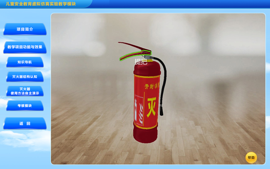 本模块通过3D动画形式,对生灭火器的构造、使用方法及其在幼儿园的存放位置进行虚拟展示,使学生对以上信息进行直接的观摩,形成直观的印象。