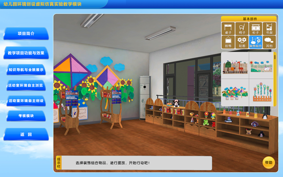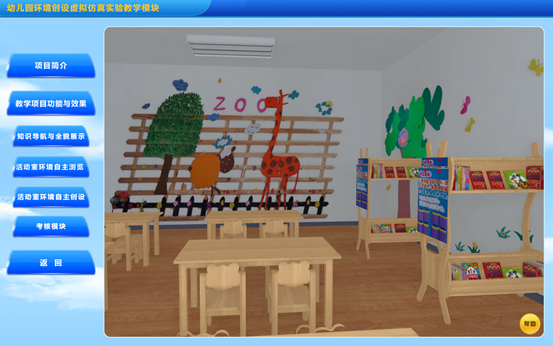 活动室环境创设虚拟仿真实验教学项目针对幼儿园活动室环境创设不易表达、创设耗时耗力耗材、理论讲解不直观等现实困境,利用flash动画模型,以主题为线索,运用3D仿真技术模拟幼儿园活动室环境的创设过程,对幼儿园活动室的重要区域进行互动展示,学生可自主进行互动操作。通过活动室环境创设虚拟仿真实验,使学生了解活动室环境创设的相关知识、掌握活动室环境创设的原则与方法,培养学生今后实习和工作时的环境实践创设能力、加深对幼儿园教育教学特殊性的理解。