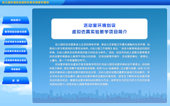本实验项目主要包括幼儿园活动室环境知识导航与全貌展示、幼儿园活动室环境虚拟仿真自主浏览、幼儿园活动室环境自主创设、考核模块。