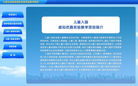 通过入园环节教育虚拟仿真实验,学生直观了解儿童入园的过程、掌握儿童入园的生活常规,理解儿童入园的指导要点以及培养学生对儿童入园的指导教育能力。