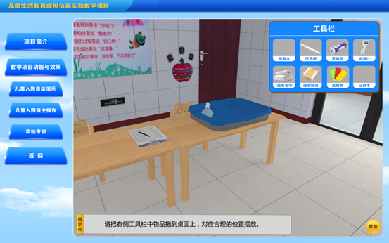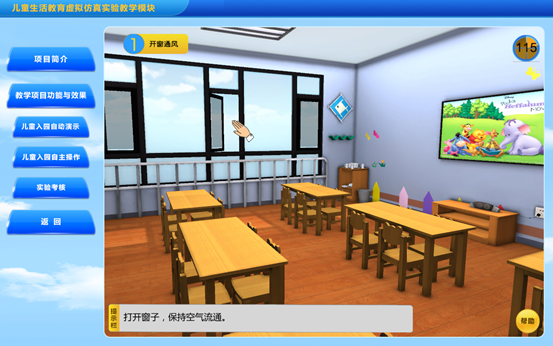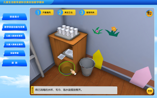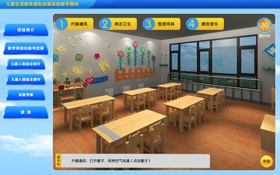 该实验模块是对儿童入园的几个环节进行虚拟展示,包括教师提前做好准备工作,例如开窗通风、准备生活用水、消毒的毛巾、水杯;儿童进园时主动向家长道别,和老师同伴问好,教师热情招呼儿童;协助保健大夫做好晨检,并对特殊情况作好记录;核实人数,做好登记;指导值日生工作等。