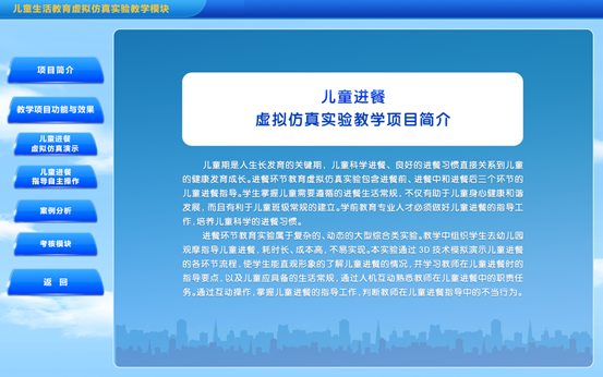 本实验项目主要包括儿童进餐虚拟仿真演示、儿童进餐指导自主操作、案例分析和考核模块四大模块。下面对各个模块的功能分别进行介绍: