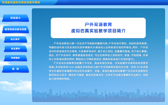 户外活动双语教育实验属于不可及、高成本综合实验,对实验操作环境和指导语要求较高。本实验采用flash动画技术再现幼儿园户外双语教育实验的全过程,利用3D技术使学生在虚拟仿真情景中自主的互动操作、检查,系统形象直观地掌握户外活动双语教育实验的知识与技术,降低学习难度、增加实验真实性,为学生专业理论掌握和专业能力、创新能力培养提供帮助。