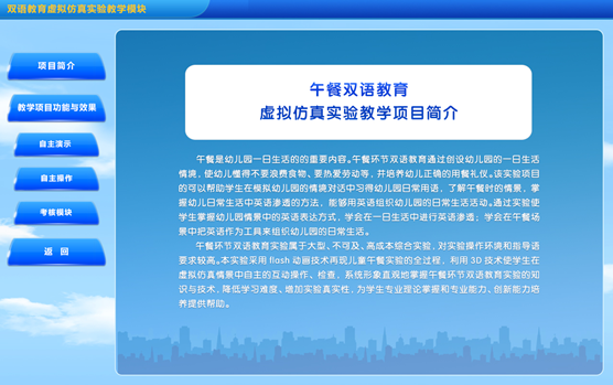 午餐环节双语教育实验属于大型、不可及、高成本综合实验,对实验操作环境和指导语要求较高。本实验采用flash动画技术再现儿童午餐实验的全过程,利用3D技术使学生在虚拟仿真情景中自主的互动操作、检查,系统形象直观地掌握午餐环节双语教育实验的知识与技术,降低学习难度、增加实验真实性,为学生专业理论掌握和专业能力、创新能力培养提供帮助。