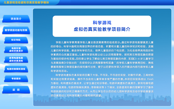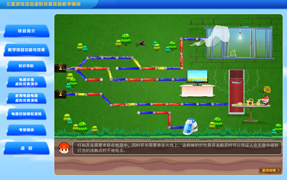 科学游戏虚拟仿真实验项目属于大型、不可及、不可逆的实验,对操作环境、工具材料和实验过程要求较高,操作不当会给儿童带来非常严重的伤害。本项目实验系统以Flash为基础,利用虚拟仿真技术,让学生通过知识导航、电路环境虚拟仿真演示、家用电器电路虚拟仿真演练、电路控制模拟演练、考核模块等5个模块,全面直观形象的理解学习了基本电路联接的知识和正确操作方式,从而让学生在以后的幼儿园科学游戏活动中学会借鉴该项目激发幼儿对科学现象的兴趣和探究欲望。