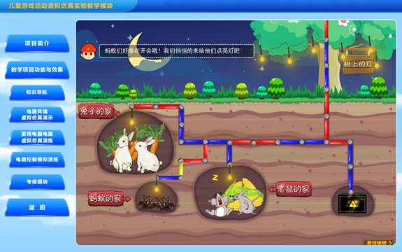 通过科学游戏虚拟仿真实验项目,使学生基本掌握电器元件的联接方式,了解电路的特性和功能,具体步骤与要求如下:
