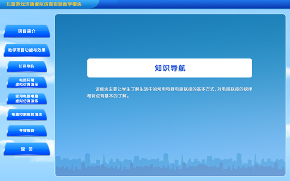 本实验项目系统主要包括知识导航、电路环境虚拟仿真演示、家用电器电路虚拟仿真演练、电路控制模拟演练、考核模块5个部分。
