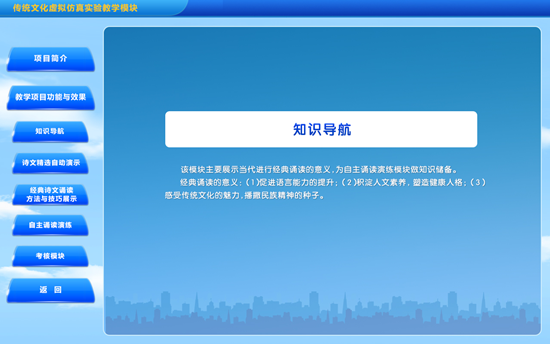 本实验项目主要包括知识导航、诗文精选自动演示、经典诵读的方法与技巧展示、自主诵读演练、考核模块。