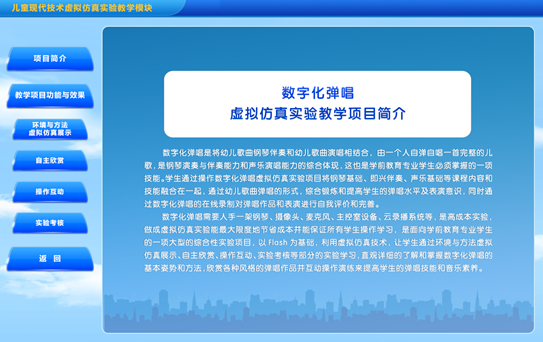 数字化弹唱需要人手一架钢琴、摄像头、麦克风、主控室设备、云录播系统等,是高成本实验,做成虚拟仿真实验能最大限度地节省成本并能保证所有学生操作学习。这是面向学前教育专业学生的一项大型的综合性实验项目,以Flash为基础,利用虚拟仿真技术,让学生通过环境与方法虚拟仿真展示、自主欣赏、操作互动、实验考核等部分的实验学习,直观详细的了解和掌握数字化弹唱的基本姿势和方法,欣赏各种风格的弹唱作品并互动操作演练来提高学生的弹唱技能和音乐素养。