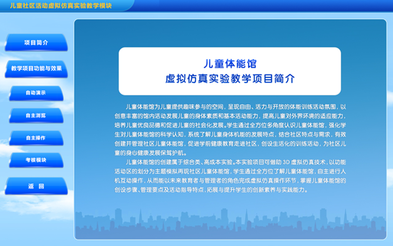儿童体能馆的创建属于综合类、高成本实验。本实验项目可借助3D虚拟仿真技术,以功能活动区的划分为主题,模拟再现社区儿童体能馆。学生通过全方位了解儿童体能馆,自主进行人机互动操作,从而能以未来教育者与管理者的角色完成虚拟仿真操作环节,掌握儿童体能馆的创设步骤、管理要点及活动指导特点,拓展与提升学生的创新素养与实践能力。