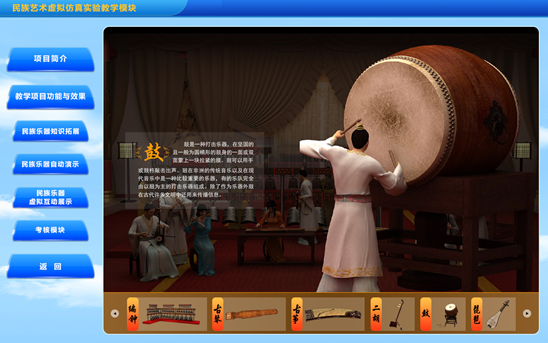 民族乐器欣赏在实验教学中属于大型、不可及的综合实验。该实验主要通过3D动画的形式,结合大学生的课程设置与知识结构需要,把虚拟演奏与文字说明结合起来,模拟十种民族乐器演奏姿势,重现民乐演奏的场景及音色,具有可操作的特点,帮助学生提高理论与实践相结合的能力,让学生欣赏中国最经典的民族乐器的艺术魅力,提高学生的音乐素养。