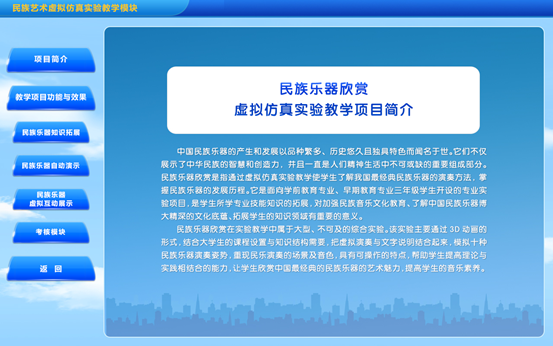 本实验系统主要包括民族乐器知识拓展、民族乐器自动演示、民族乐器虚拟互动展示、实验考核四大模块。下面对各个模块功能进行介绍: