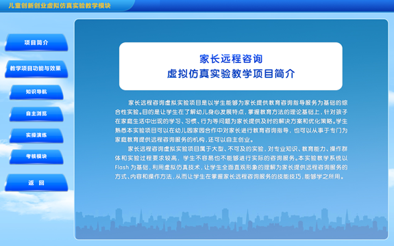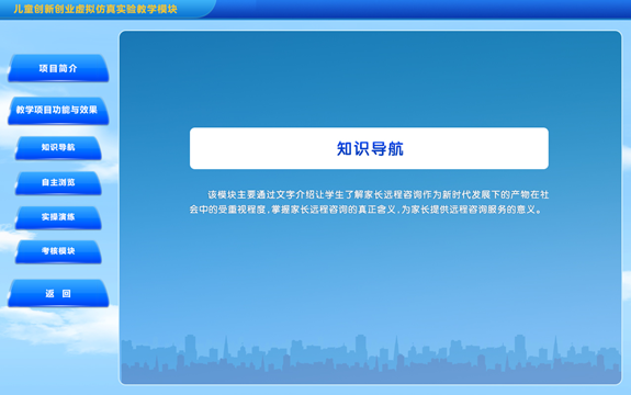 家长远程咨询虚拟实验项目主要包括知识导航、自主浏览、实操演练、考核模块4个部分。