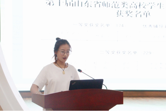 李梅同学详细介绍了关于省赛流程中推选组、抽选组两大类别,并分享了自己参赛的心得体会。她在分享中还特别强调,要坚定信念、笃行不怠,在参照山东省编教材写详案不要一味模仿,要有自己的创新点,认真对待每一次的比赛。最后,李梅同学为同学推荐学习公众号与软件,鼓励同学们做好相应知识和技能储备,迎难而上,直面挑战。