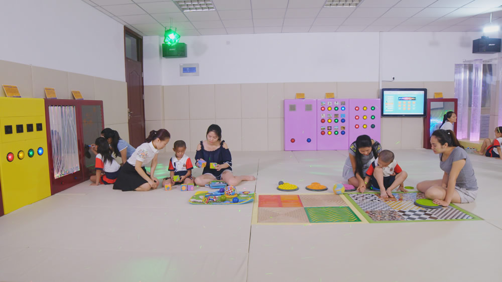 该实验室整合了多元智能理论和婴幼儿发展阶段理论,从婴幼儿视觉、听觉、嗅觉、触觉发展需求为出发点,提供由中央多媒体控制的多感官实验模块设备,采用婴幼儿适合且喜欢的操作体验方式,通过引导其与灯光、色彩、气味、质地等多元材料的互动,在自然自信的放松状态下实现感知、认知、运动、情绪的统合发展,全面辐射促进儿童语言、数学逻辑、空间、运动、音乐、人际交往、内省、自然观察等潜能的发展。