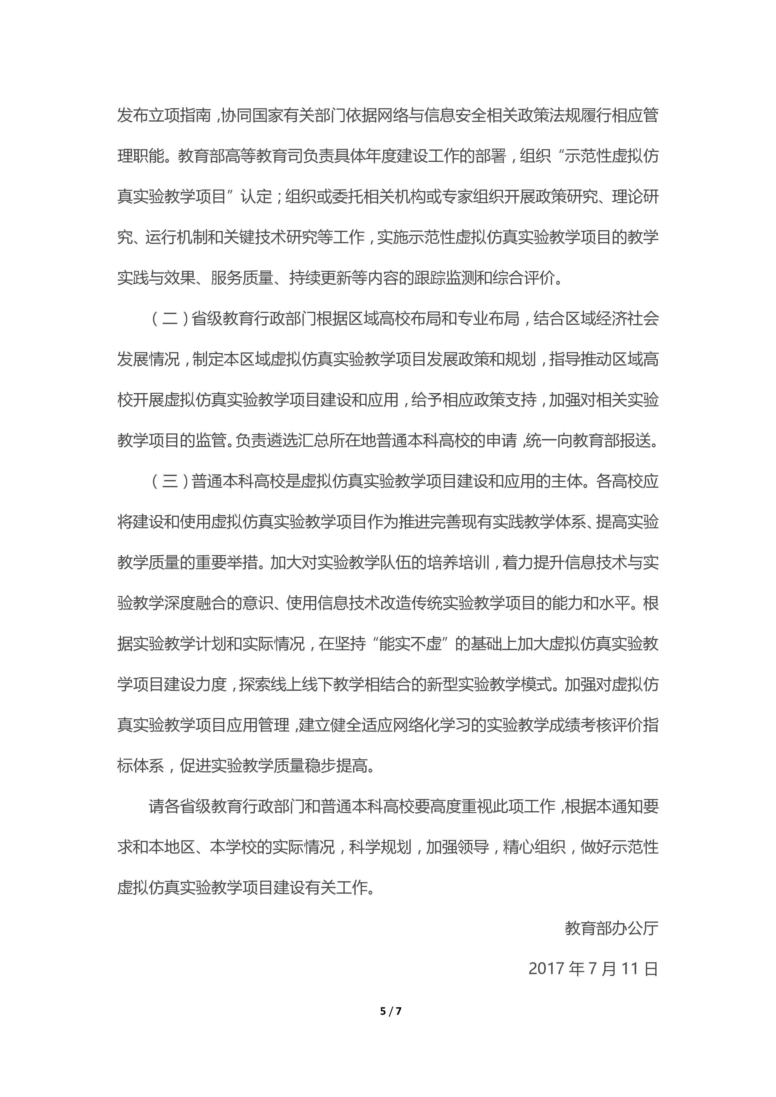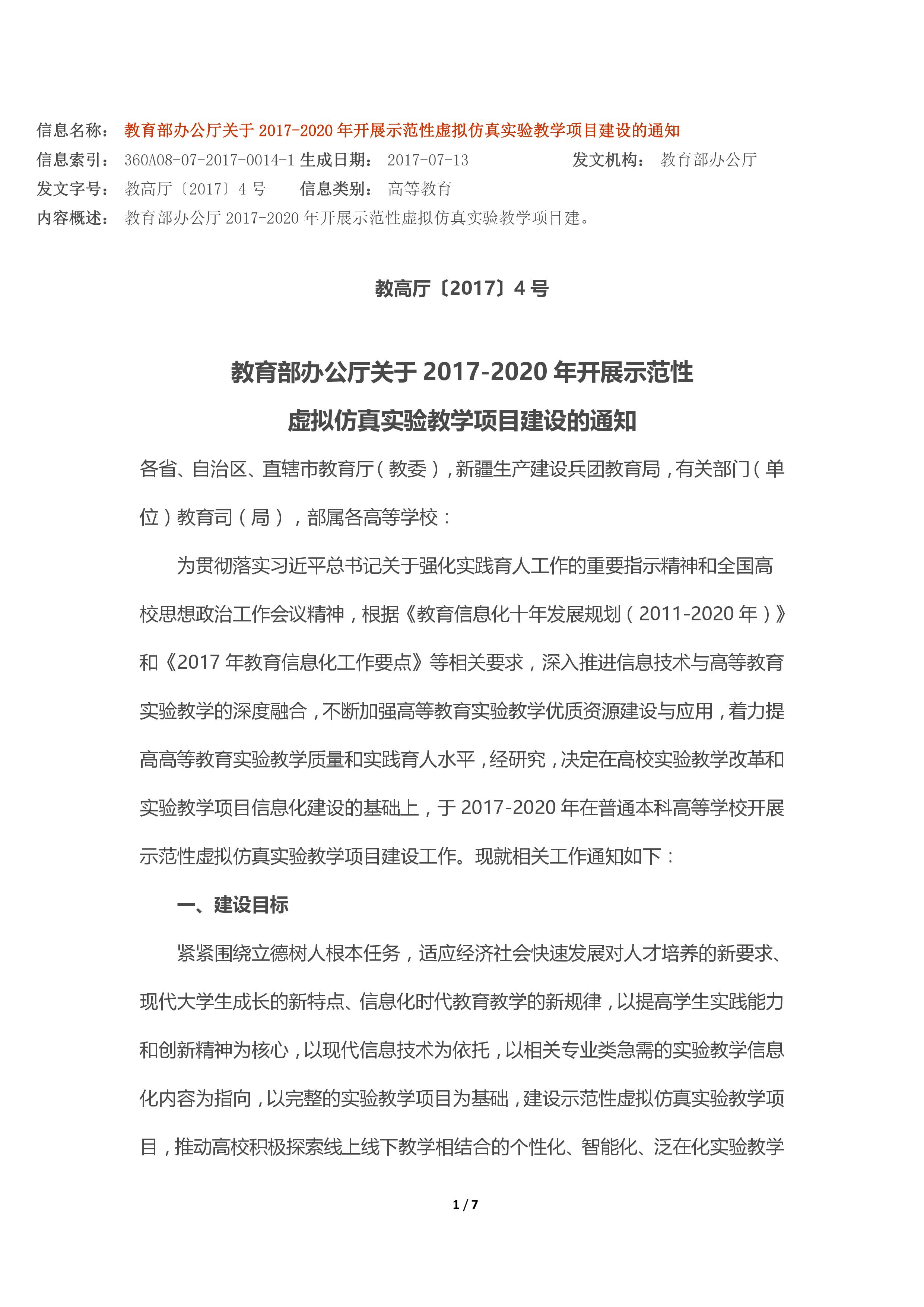 教育部办公厅关于2017-2020年开展示范性虚拟仿真实验教学项目建设的通知